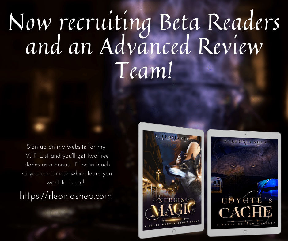 So here’s my recommendation if you’ve never read my books – go ahead and sign up and read the two bonus stories. Nudging Magic takes place after the second book in the series, but I’ve kept spoilers to a minimum. Coyote’s Cache takes place after the fourth book. Again, the fact that you’re jumping in that late means there are bound to be some spoilers, but I’ve kept them to a minimum. If you like what you read, then stay on the list and become one of my valuable Beta Readers or ART members.
