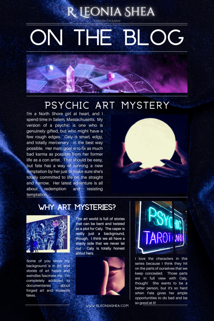 This series allowed me to combine several things I’m interested in. In addition to the location, I centered the first two stories around art. I’ll confess, the third one will touch on that as well – but after that, Caly might have some new clients to help.